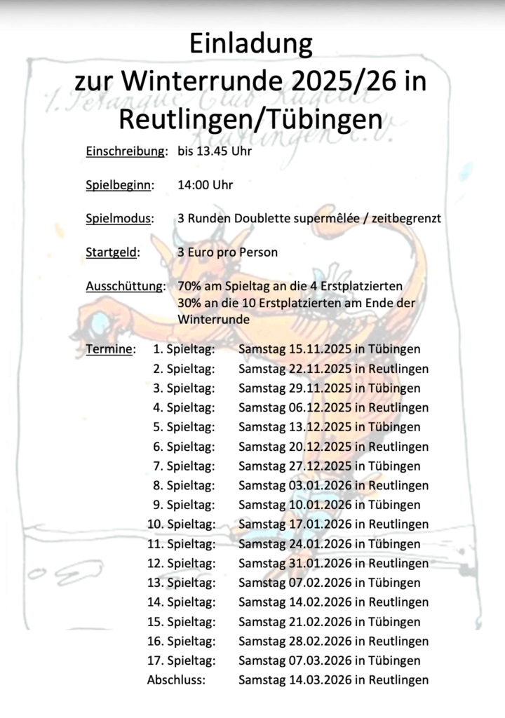 Einladung zur Winterrunde Beitrags-Autor:admin Beitrag veröffentlicht:13. November 2025 Beitrags-Kategorie:Blog Das könnte dir auch gefallen Vereinsmeisterschaft 5. Oktober 2025 Bruno, Daniel und Armin sind Landesmeister 8. September 2024 Herbst-Turnier begeistert mit starken Spielen und Überraschungssieg 26. Februar 2025